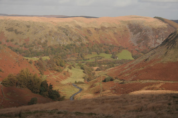 The view down the Rhiwnant valley on the descent from the boggy wilderness above